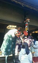 - 一応、休みということにはなっているが、ボチボチ始動するかあ、という感じで、まずはパソコンの写真整理を始める。作業をしていると、なにかお囃子が聞こえる。近所の杉並区立郷土博物館でお正月恒例の「大宮前の獅子舞・大黒舞」が古民家で演じられているのだ。徒歩3分ほどの所だがお囃子が聞こえて、支度してと、おトイレ行ってと手間取ってしまった。まだ間に合うかなぁと言いながら夫と出かける。演じる時間は30分ほどなので就いた時には終わっていたが、獅子舞が頭を噛んでくれる時間になっていった。小さい子もいたが大泣きする子はあまりいない。怖がって遠巻きに見て居る子は何人かいる。携帯のカメラでその様子を撮影。すっかり終わって獅子舞を外した人はずいぶん若い(10代!?)お兄ちゃんでビックリした。