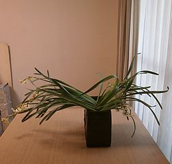 - 午前中、紀尾井町お手入れ手伝い。一昨日大がかりないけ替えをされたそうで、本日は水足しと掃除くらいで済み、1時間ほどで終了。一度帰って、改めてお花のお稽古へ行く。毎年 稽古始めは水仙一式。三方向から写真を撮ってみた。