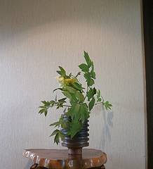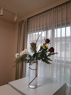 - 午前中、二子玉川お手入れ。本日は一旦全て抜いて花を入れ替える総取っ替えをする。磯部彩映・五本木昌広いけばな作品・松、グロリオーサ、ドラセナ、ビバーナムコンパクター、紅葉ヒペリカム、ナルコラン、紅葵